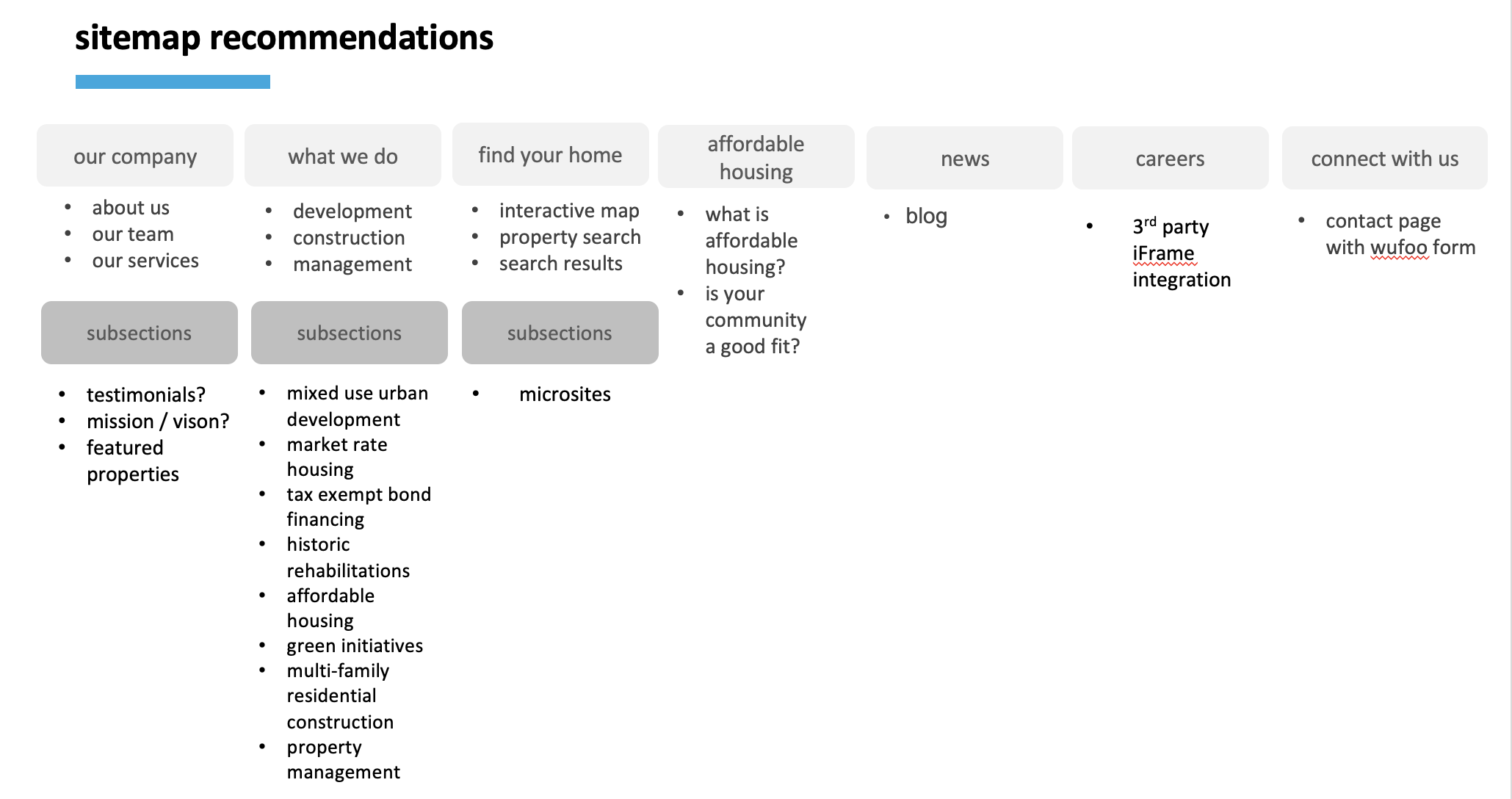 During the early rounds of project management’s planning and a collaborative discovery call that involves a representative from all the responsible teams (clients, project manager, account manager, designer, developer) a creative brief outlining the project’s strategy, including a preliminary sitemap was created. This R1 sitemap utilizes TWG’s previous website structure as a starting point, with the flexibility to reassess as design rounds continue & clients identify new content or pages they may want to include.