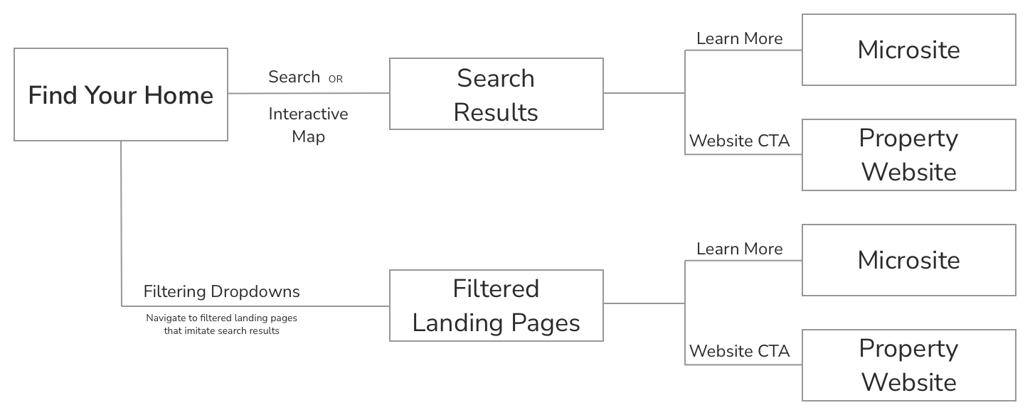 Due to the requirements and limitations of the LeaseLabs CMS, the strategy for utilizing both an angular search functionality with filters that should display an identical list of results meant utilizing landing pages and accounting for them in the user flows.