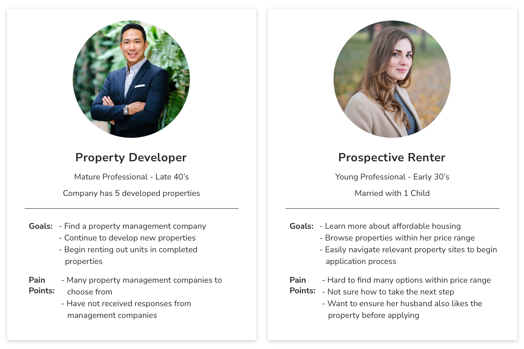 Speaking with the Chief Expierence Officer at TWG, we identified the audiences would be both developers looking to work with TWG, as well as current and prospective residents of the company. Knowing both our goals and our objectives was key for our design choices. From there, two personas were created.
