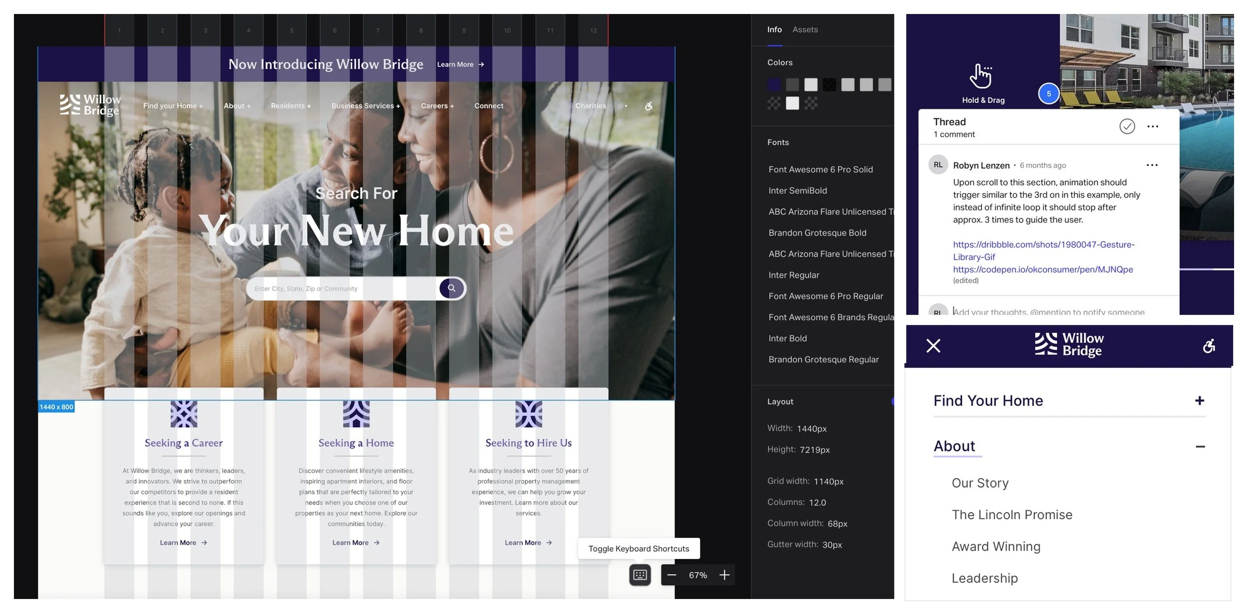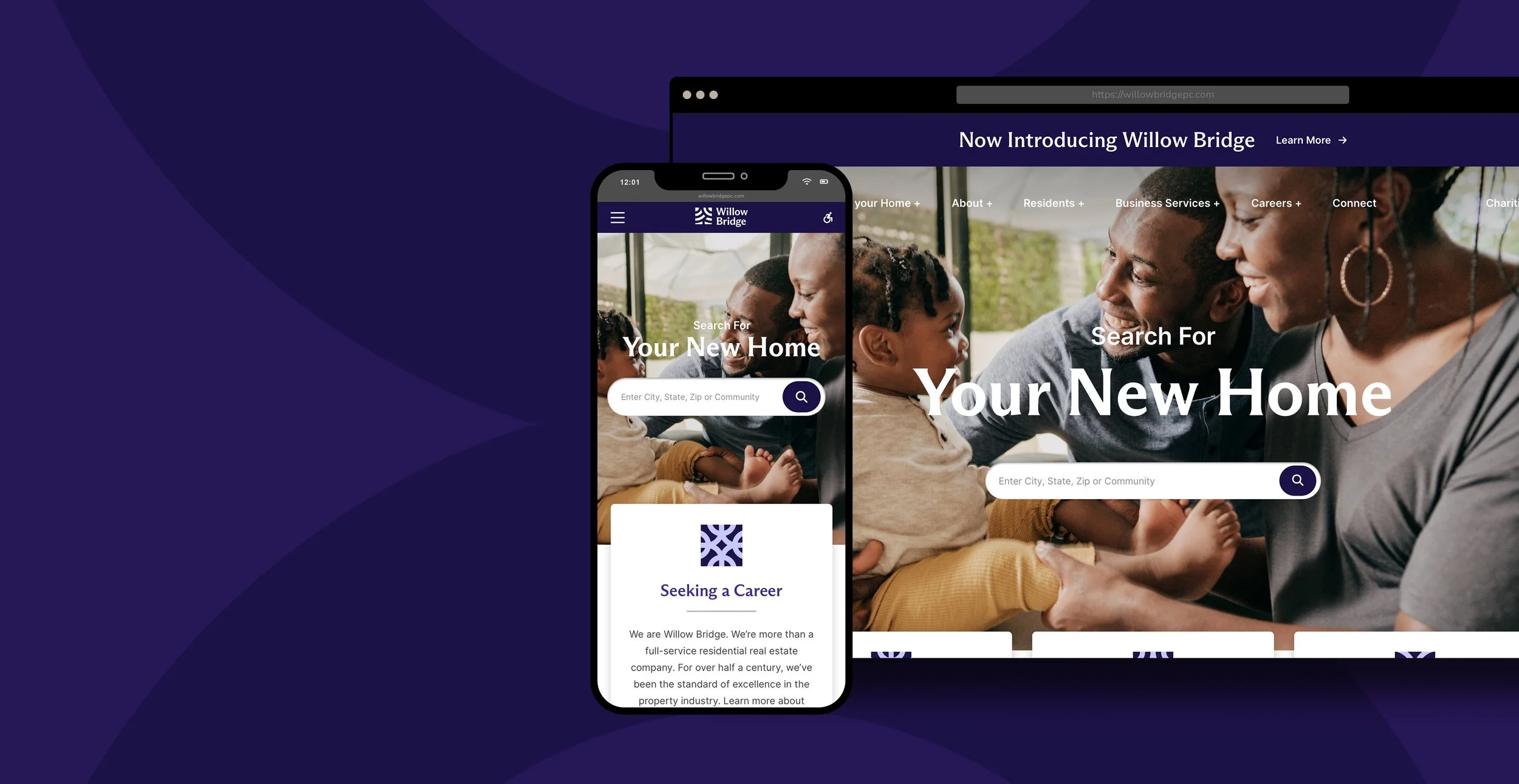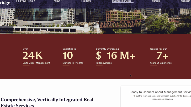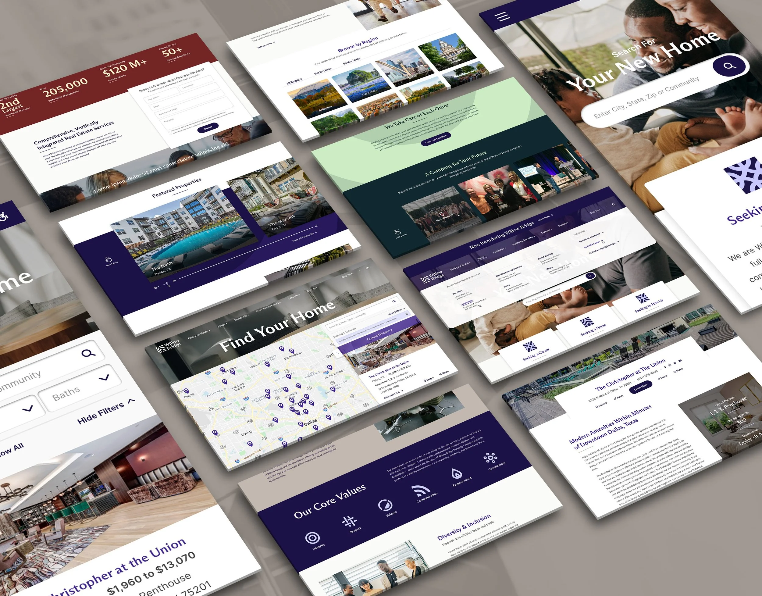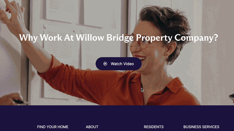 With the complete renaming of Willow Bridge ( fka Lincoln Property Company) came an entirely new set of brand guidelines. To update the website to suit a much more professional and clean look, we must first understand the comprehensive brand guidelines set by an external agency. Lots of care was placed into adapting so many intentional brand choices into a website for Willow Bridge and their new brand.