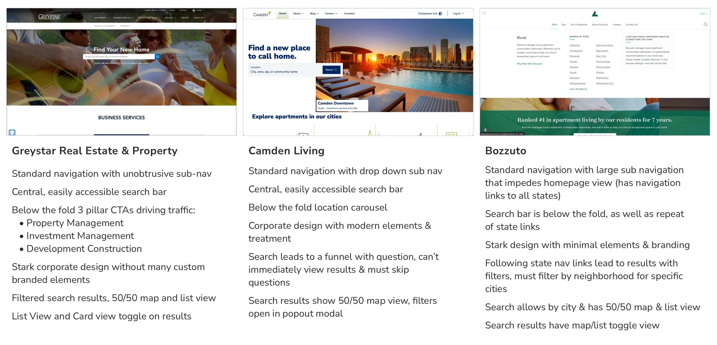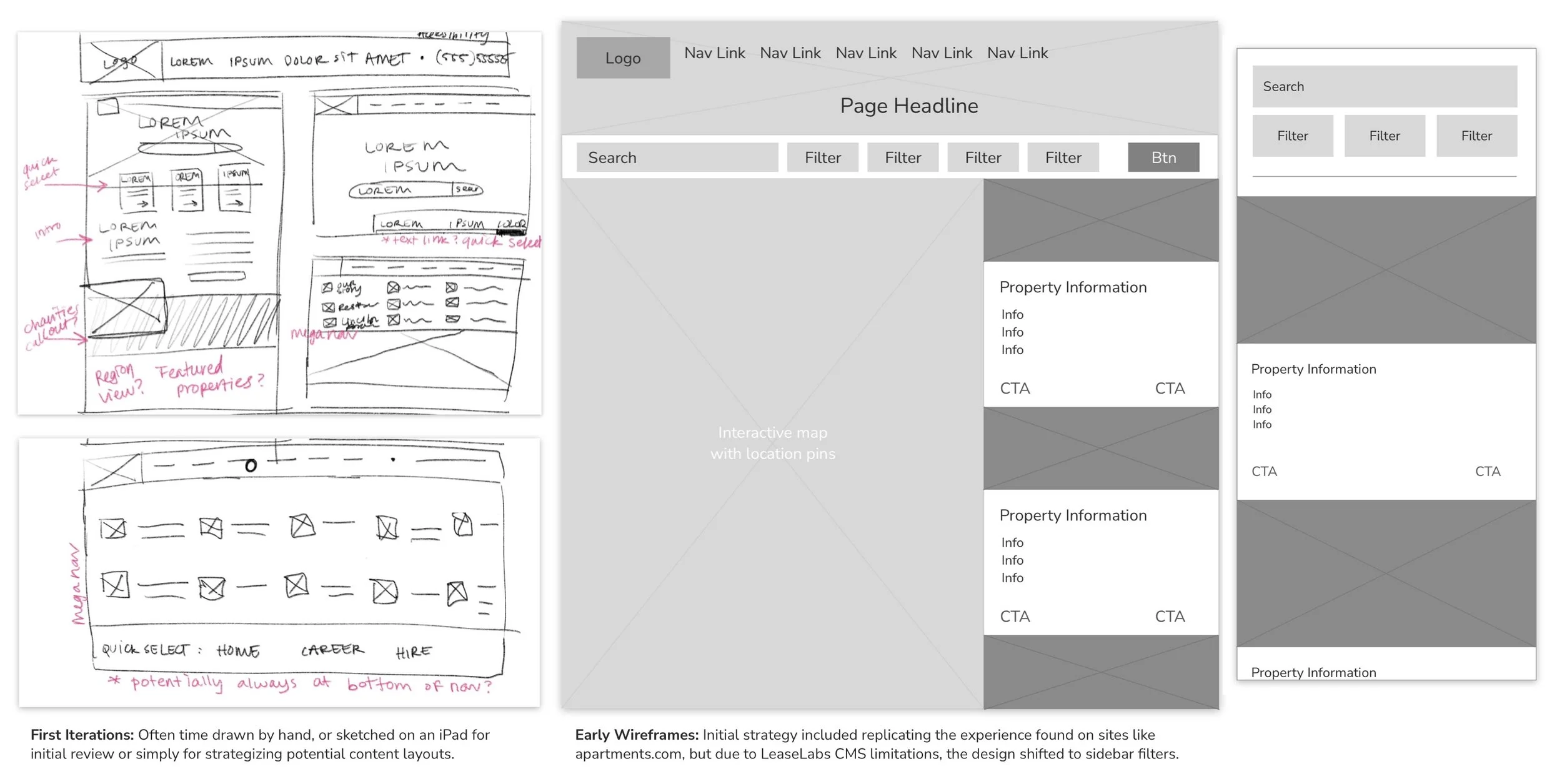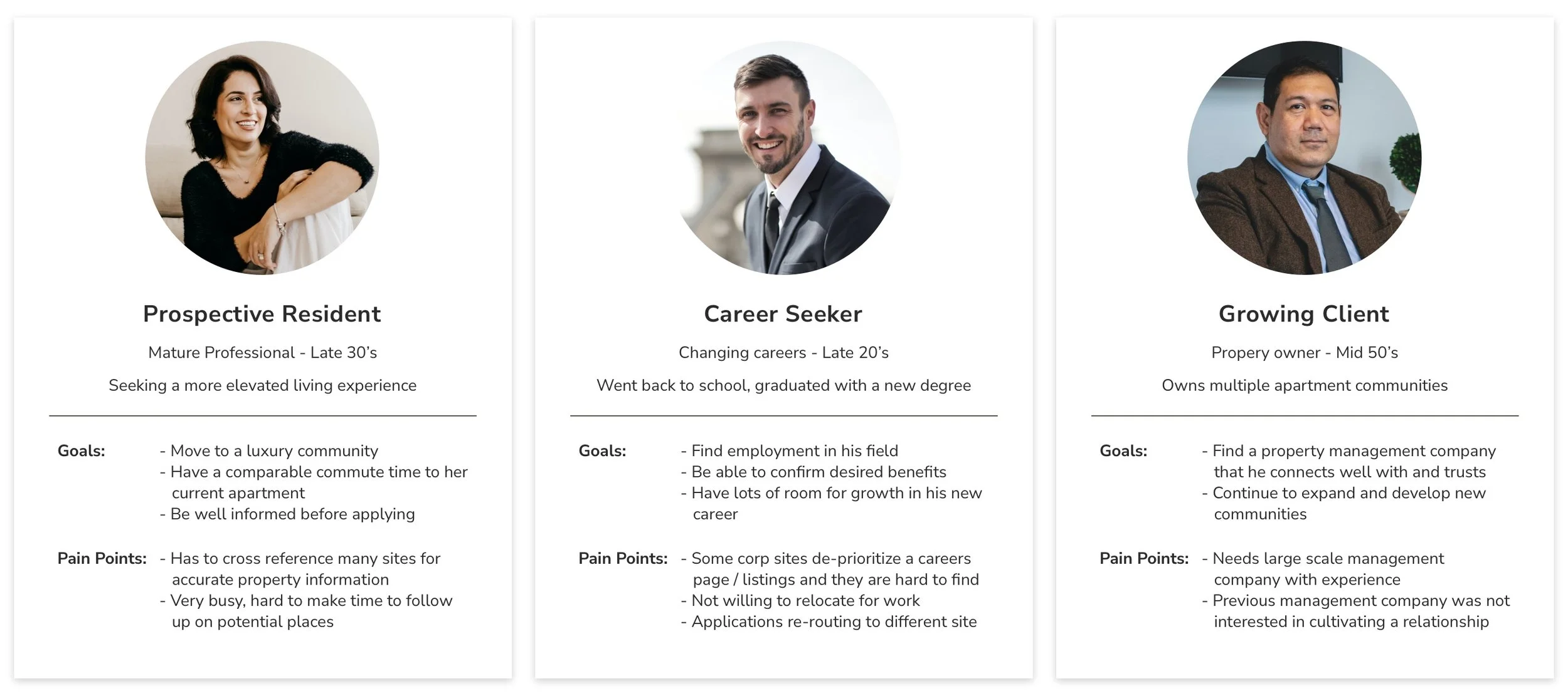 Due to Willow Bridge Property Company’s rich history and widespread reach within the multifamily industry, the demographic of visitors who will use this website is quite extensive. Working with the Vice President of Marketing and Communications, we identified three core groups to focus on while designing this site. A large number of the employees are female, and residents are also skewed female. With that knowledge we created three personas: